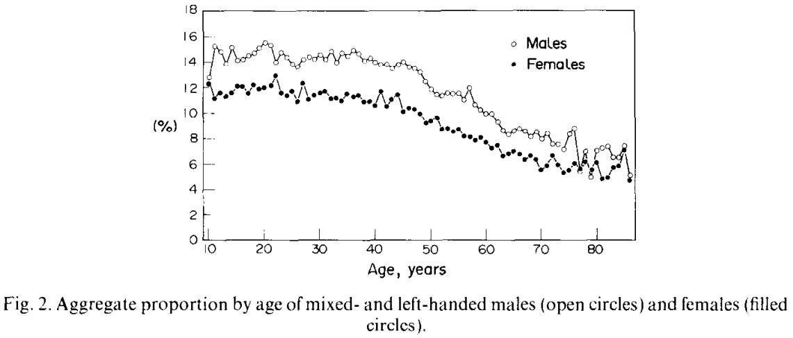 (from Gilbert, A. N., & Wysocki, C. J. (1992). Hand preference and age in the United States)