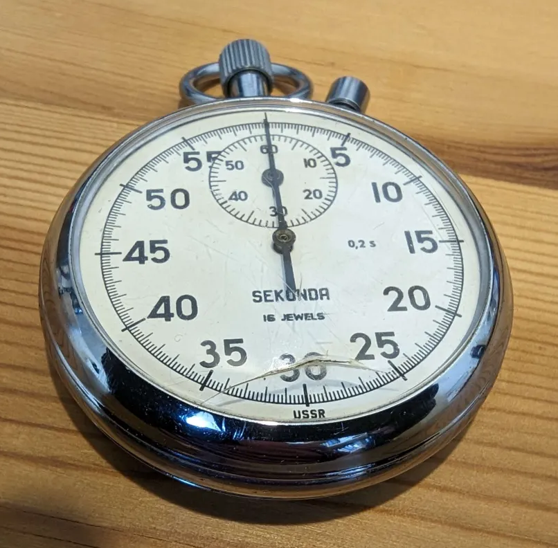 It’s a fully analogue hand-wound mechanical stop watch, apparently from the USSR. I ordered it second hand on ebay, and it arrived today. I really like it.