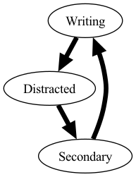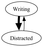 Where thickness of line indicates how easy the transition is. Because it is easy to transition from Writing to Distracted but not vice versa, you spend a lot of time in Distracted.