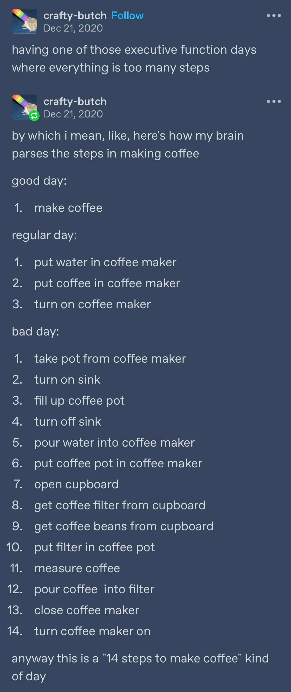 There’s a concept of “14-step coffee day” that I have from a now-deleted tumblr post: