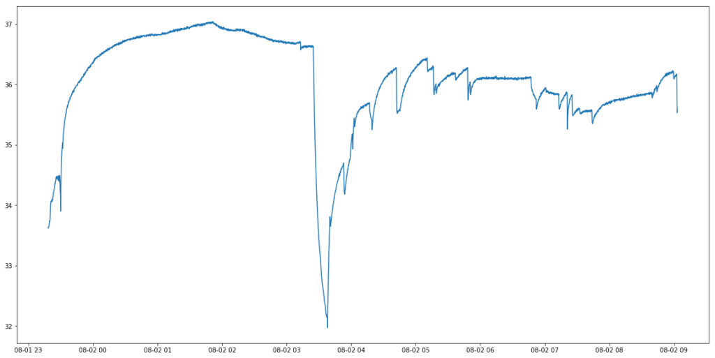 It’s hard to say for sure though. The sharp drop at around 3:30 followed by the subsequent variability of the temperature is almost certainly not a result in changes of my body temperature (If your body temperature actually drops to 32 degrees then you are suffering from acute hypothermia and require immediate medical attention), but instead a result of the sensor coming partially detached. I’m going to try to get a more accurate reading tonight by, well, doing the obvious thing and sticking the thermometer up my butt (apologies for TMI, but science). Update: This didn’t work well. The HealthyPi thermometer is very poorly shaped for it.
